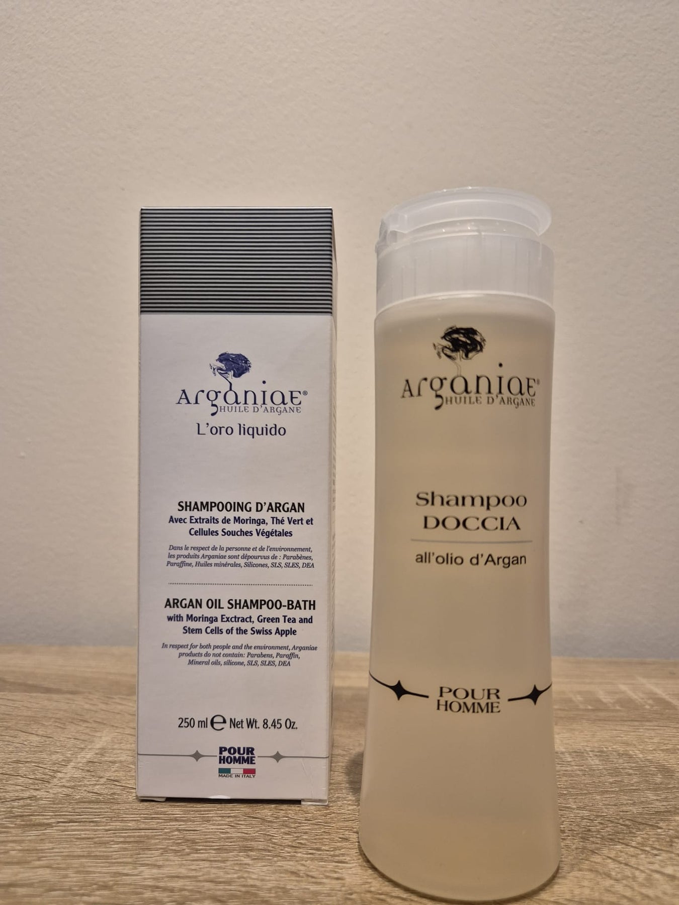 Le shampooing-bain à l'huile d'argan pour hommes nourrit la peau et les cheveux, leur donnant un aspect sain. Ses principes actifs ont un effet nourrissant, protecteur et hydratant. L'extrait d'Argania Spinosa, le Thé Vert et les Cellules Souches de la Pomme Suisse rendent la peau douce et facilitent le coiffage des cheveux, tandis que l'extrait de Moringa les protège du stress environnemental. C'est une solution anti-stress et tonifiante, adaptée après le sport et le travail. Il est intensément parfumé, crémeux et procure au corps et aux cheveux une agréable sensation d'énergie et de bien-être tout au long de la journée.